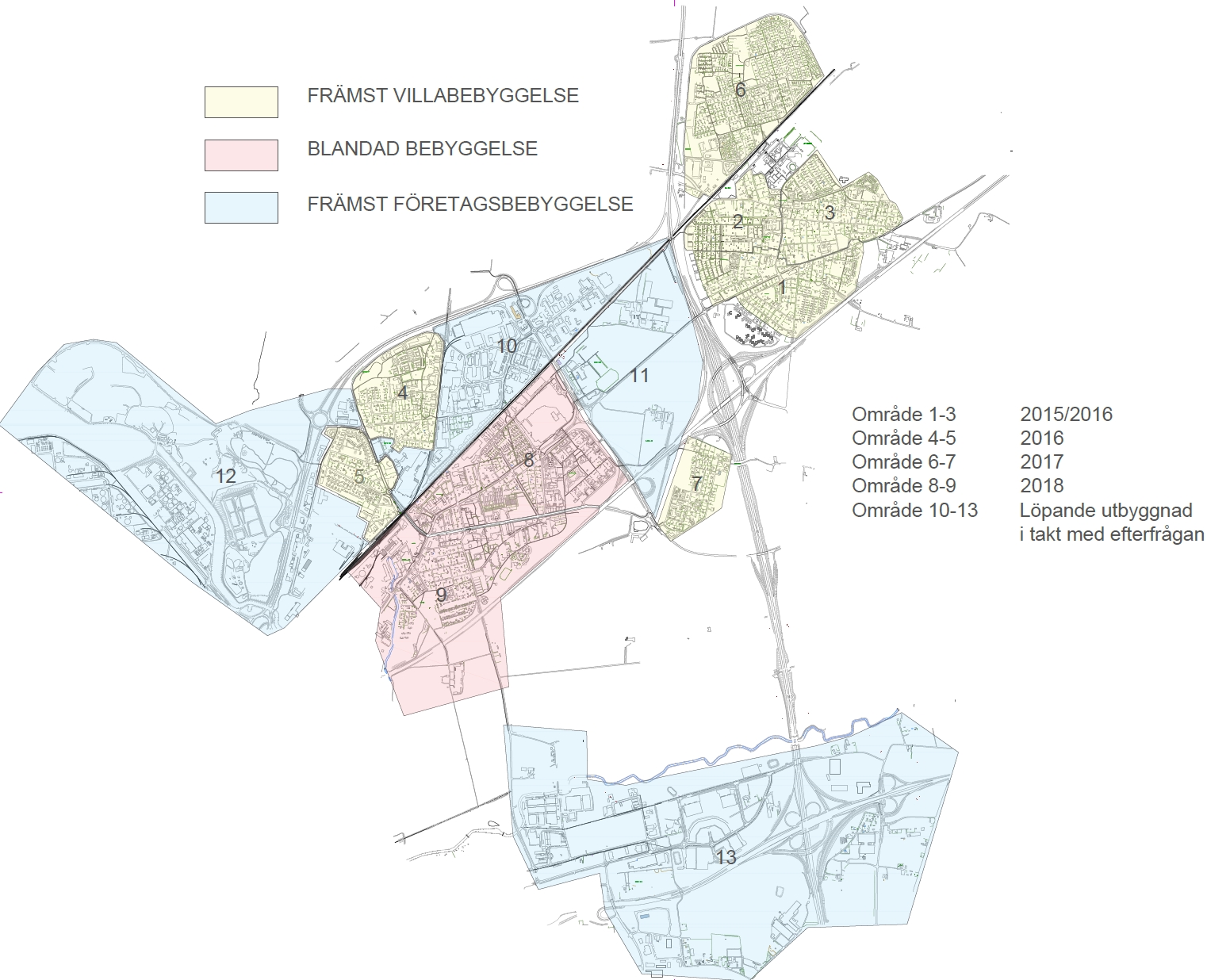 Preliminär utbyggnadsplan: Område 1-9 är beslutade utbyggnadsområden för anslutning av villor.